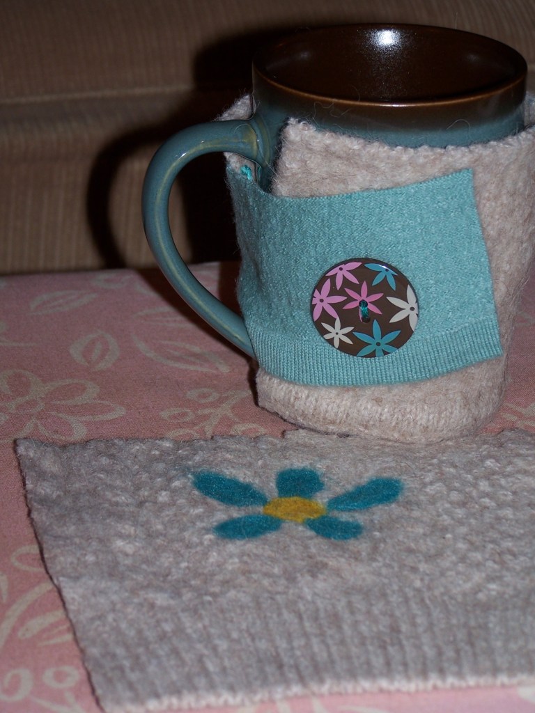 Project 1: cup cozy and coaster Published February 12, 2012 at 1932 × 2576 in Watch out! Project #1 Felted sweaters with needle felting.