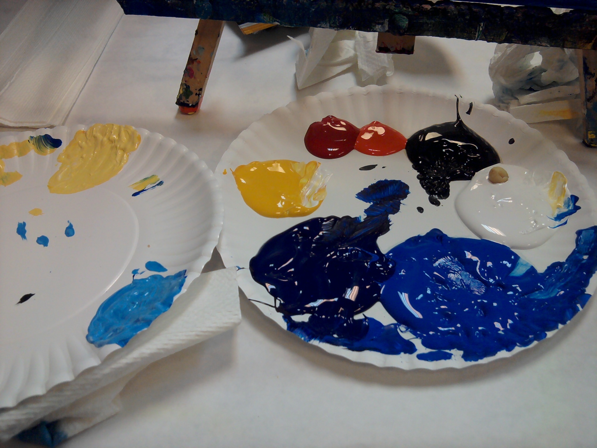 setup Published April 15, 2012 at 2048 × 1536 in Happy little bats One paper plate held the colors we needed for the evening’s work, and the other provided a palette for blending.
