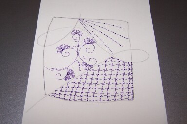 So I added in a couple more blooms, paying attention to rounding the petals this time. In the meantime I’d filled another segment of the string with Beadlines. This is one of the few tangles without an actual diagram of how to draw it, because it’s pretty simple and apparent.