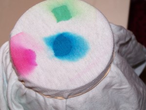 I decided making it not flesh* color in some way would probably decrease that effect, or my neurosis about it anyway. I considered a tie-dye look craft I’d seen done with Sharpies and rubbing alcohol, but the attempt I made on a test piece (I KNOW!! For once I used a TEST PIECE!) wasn’t awesome, so I decided not to go for that.
