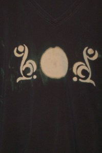 This last picture is the t-shirt rescue I like best. I’ve seen this one on Pinterest too. You make a design with the Chlorox pen on a colored shirt, let it rest 30 minutes, then wash. I freehanded the design, based on one of my favorite ZenTangle designs, the henna drum. I simplified it way down because the fine point of the double sided bleach pen is still pretty wide — it’s for stain treatment and not drawing, after all. There’s bleed, but I still love how it came out.