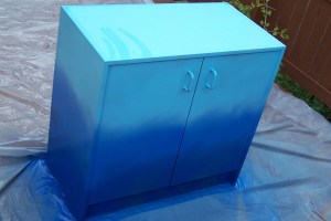 It begins with a relic of my NYC days, a crappy low cabinet of pressboard with white laminated finish. It was half of a two-piece thing, with a shelf hutch on top. The hutch is in a closet pretending to be useful pantry shelving (that is another project which will be an enormous obsession, I can tell). The cabinet has been trailing around with me through the last couple of moves (when a company pays for movers and gives you three weeks to uproot your life, EVERYTHING trails around with you), and most recently it’s been in the basement.