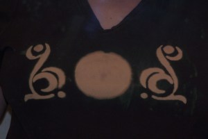 Wednesday night I made another “bleach-paint” tee on another shirt with an unfortunate rack/grease spot OTP, this time using a stencil, and I really like the design I ended up with. It will surprise no one who’s been reading along so far that it didn’t come out perfectly. I was very careful to peel off the stencil carefully, but I still got some marks on the shirt, which don’t look it in the pictures, but came out looking kind of gray.