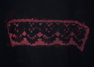 I’m extremely pleased with how it turned out. The pattern is a bit low, but now I remember I was thinking of flipping the lace and doing the same thing above it, without really thinking about the fact that you have to avoid overexposing the first bit you did while working on the second. If I decide it needs more, I’ll go back and repeat the process. (But the first part should be washed and dried before repeating.) Or maybe I’ll just try on the shirt and see if I like it fine as is.
