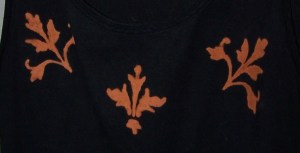The second shirt is a tank top from a local thrift shop. For this one I did a quick-and-dirty version of the process I used making my previous stenciled shirt (https://dangerouscraftsforgirls.com/2012/07/21/dont-worry-its-only-a-nip/). I used two stencils from a pack that Plaid sells of Wingdings-like patterns, flipping one to use it twice. Instead of making a stick-on stencil with Contact paper, I just lifted the stencil off as the bleach did its work and wiped it, flipped it, and did the other side of my pattern. I didn’t do any careful measurements of where to put them, either, just eyeballed it, and it came out well.