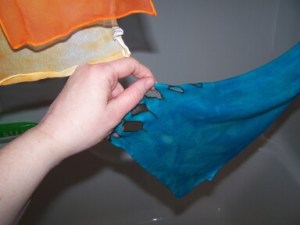 • First there’s the obvious. Like the time I was dyeing a wool/silk scarf in the microwave and completely spaced on Rule #1 of microwaving and put a couple of straight pins in my ombre-dying experiment of scarf wrapped around chopstick. And felting needles, the crafty gal’s fishhook. OW.