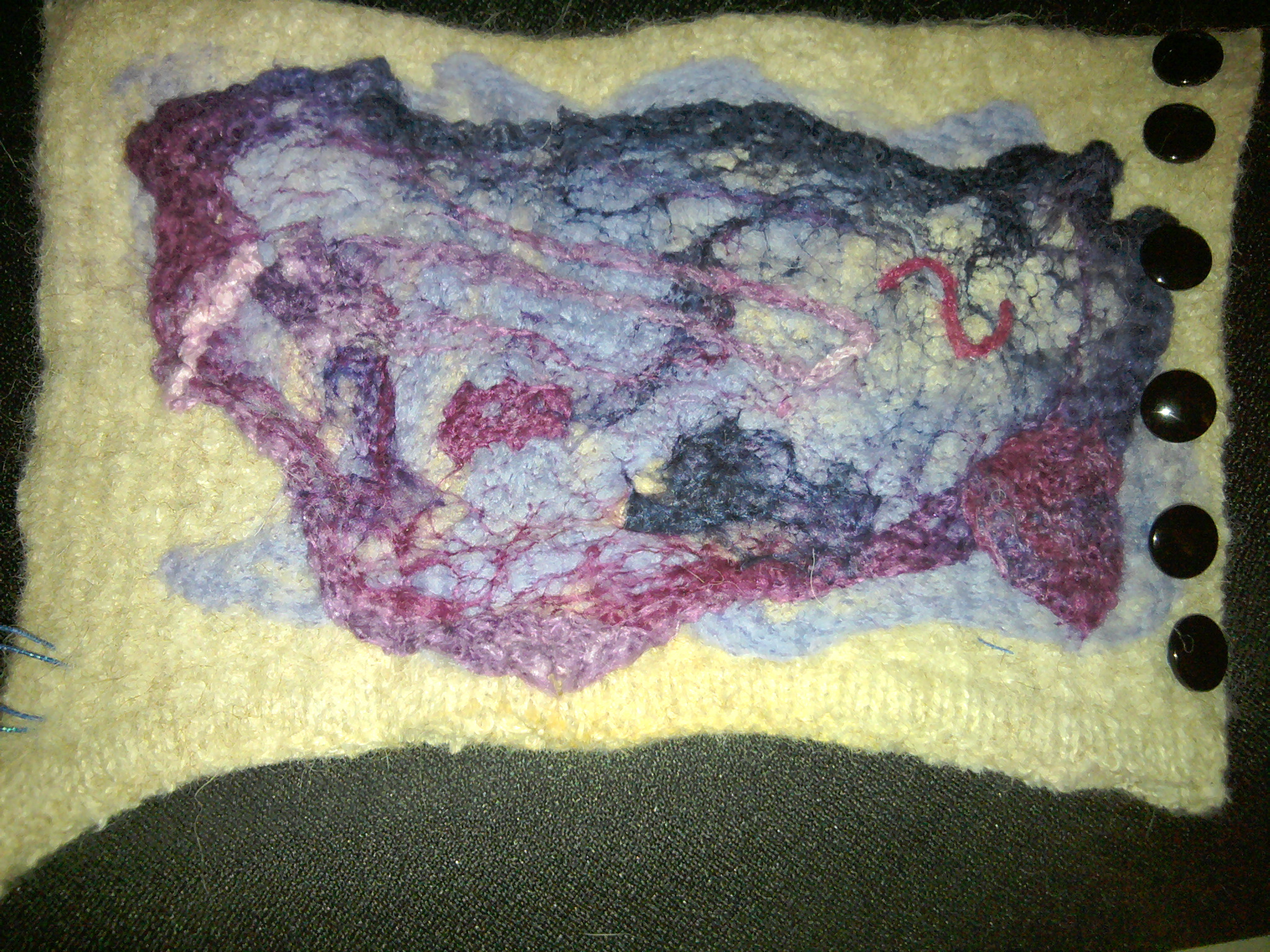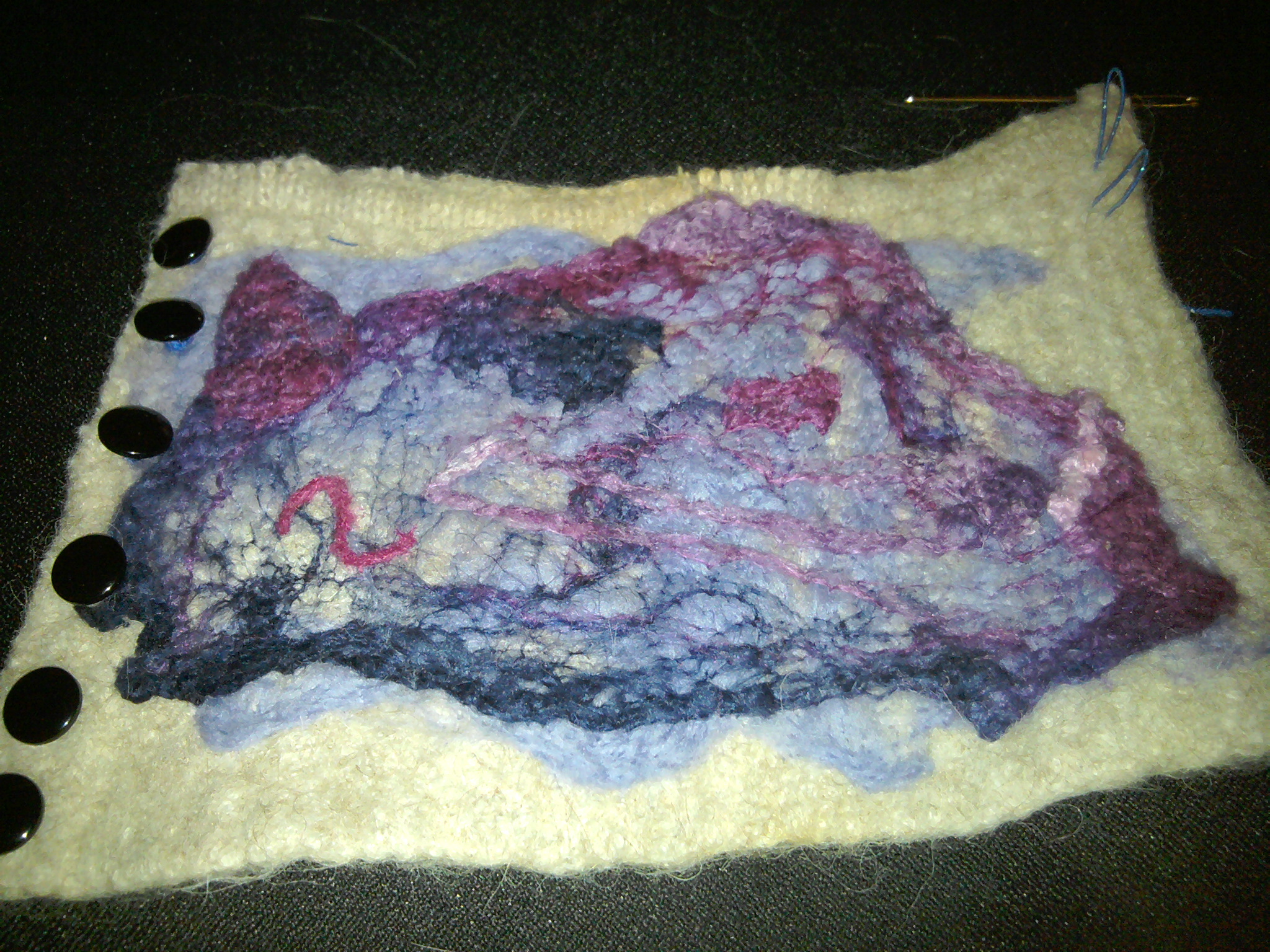 After adding the last bits of roving into the design, I am pretty happy with what I have. I did sew on a couple of wee little beads, remarkable more for the source than anything else. A year or two ago I bought an armload’s worth of wee beaded bracelets on eBay that Eliza Dushku had donated to one of her favorite causes. (I don’t even want to say what I ended up spending because I could not allow defeat.) Some of the stretchy little bracelets are so stretched out they’re just loose strings, more or less, so I had planned to use them in various projects, but this is the first. I put in three, just for a mysterious bit of sparkle, and I might add more later.